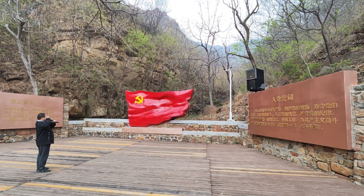 党支部一行首先抵达红谷基地,在平谷第一个党支部诞生地“红崖洞”由讲解员讲述第一党支部的来历和英烈故事。全体党员在红崖洞重温入党誓词,新党员进行宣誓。