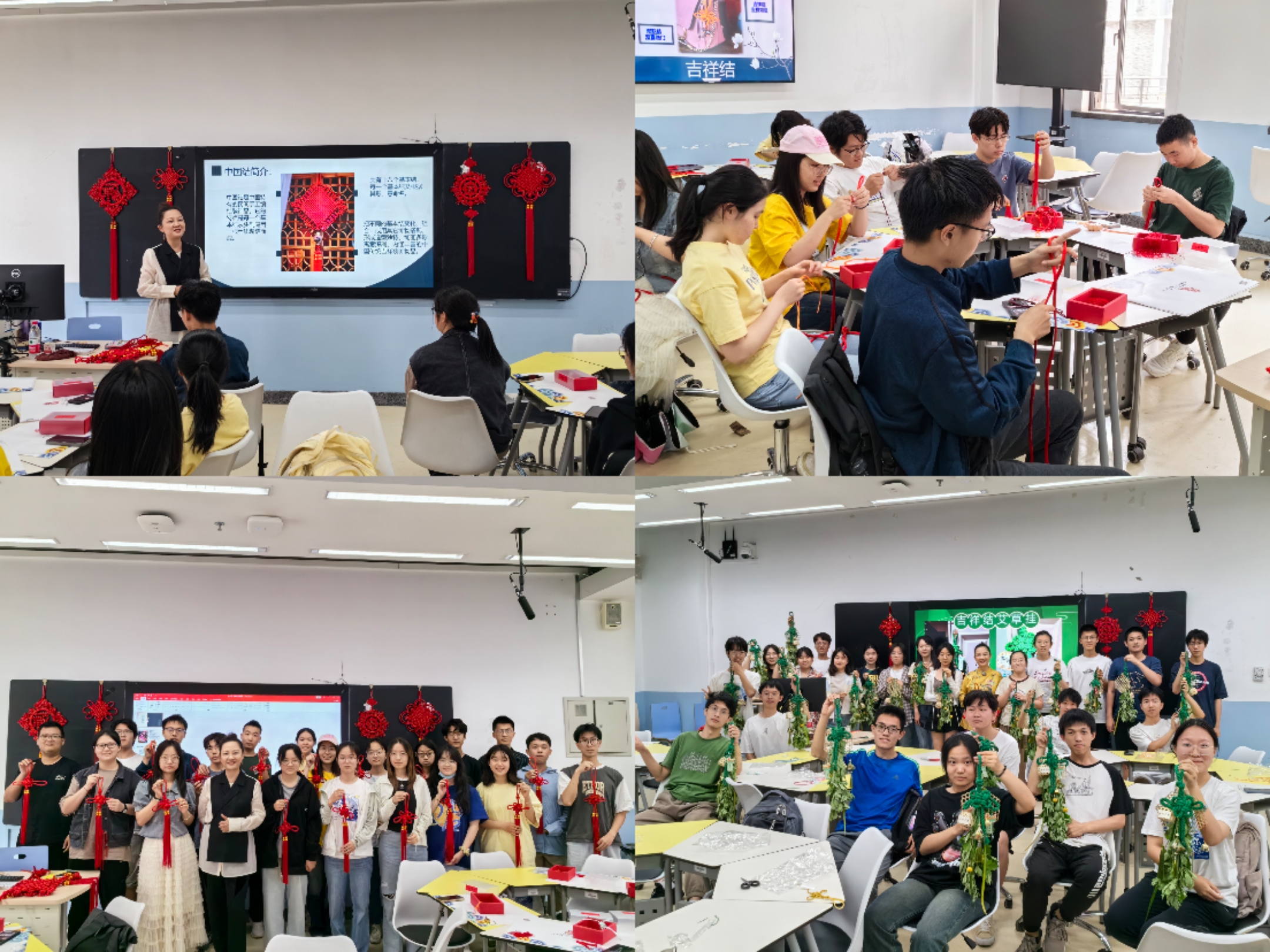 在“结韵流芳,艺展风华”主题课程中,“巧艺结艺”非遗手工技艺传承人周巧仪老师向同学们介绍绳结以及中国结的发展及内涵,并带领同学们编织出由“双连结”和“吉祥结”组成的中国结作品。端午节到来之际,再次请到受同学们欢迎的周老师为同学们带来了 “艾香飘逸,结艺传承”这一具有浓厚节日氛围的课程,周老师为大家讲述端午节的诸多民俗,同时教授编织吉祥结、组装艾草,最终制作形成独特的中国结艾草门挂,带领同学们体验独特的文化韵味。