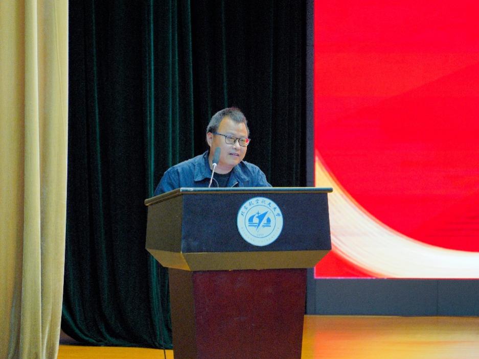 致真书院院长刘志新在启航礼上讲话。刘志新对197名问天者表示热烈的欢迎和衷心的祝贺。他介绍了九三阅兵中“大国重器”背后彰显的北航力量,并希望同学们弘扬“家文化”,营造互助氛围,同行携手成长,收获满满的认同感、幸福感和使命感;传承“好学风”,深化专业认知,夯实数理基础,筑牢学术成长和科研启航的根基;凝聚“正气旋”,厚植家国情怀,锚定发展向位,将个人理想融入中国式现代化的宏伟蓝图。