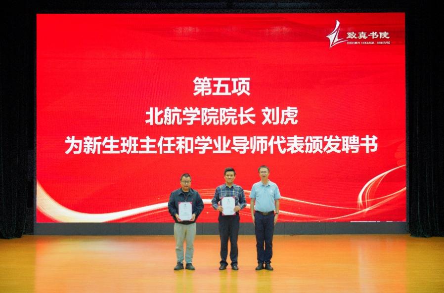 班主任是学生思想政治工作队伍的重要组成部分,学业导师是引领学生学业科研入门的重要力量,对推进全员全过程全方位育人、促进学生德智体美劳全面发展具有重要作用。启航礼上,北航学院院长刘虎为新生班主任代表和学业导师代表颁发聘书。