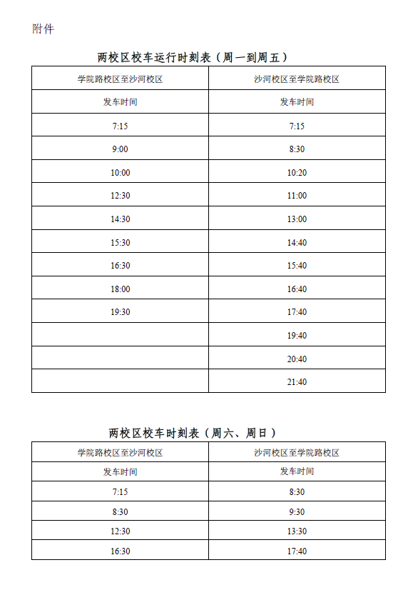 根据沙河校区工作实际情况,结合学校后勤处《关于调整校车运行方案的通知》,经研究决定自2017年9月18日起,对两校区校车运行时刻进行调整。