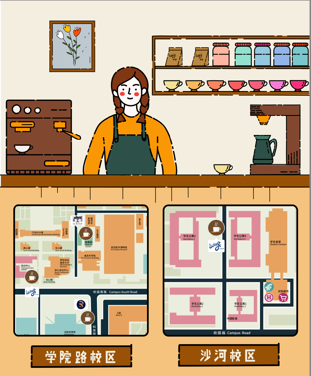 4月22日(周一)开始,我校教师在两校区的wings咖啡、致真咖啡和海棠咖啡(后附四家咖啡店位置图),仅需6元就可以体验一杯美式咖啡。