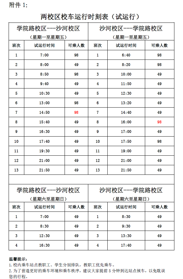 1.调整两校区校车的运载力:周一至周五,每天14:50增发一辆学院路校区至沙河校区校车,每天16:00增发一辆沙河校区至学院路校区校车,运行时间保持不变。